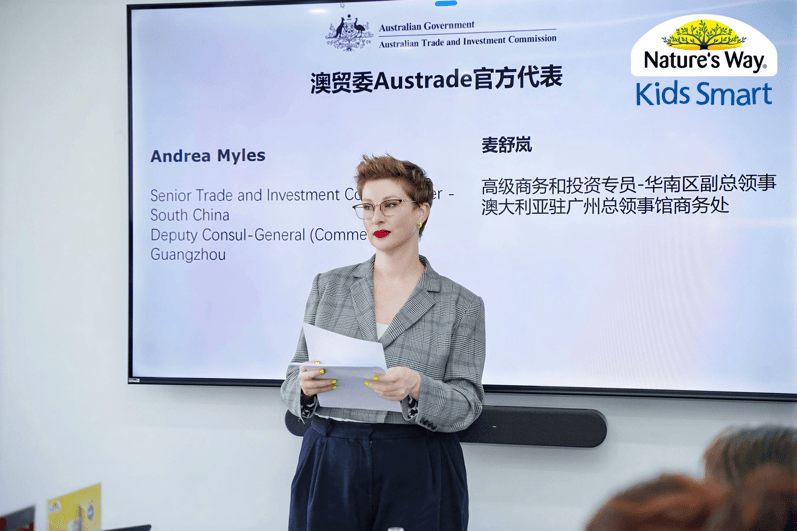 活动伊始,澳大利亚贸易投资委员会(Austrade)的高级商务和投资专员-华南区副总领事、澳大利亚驻广州总领事馆商务处Andrea Myles麦舒岚发表致辞。她介绍道:“澳贸委的主要职责就是推动与帮助澳大利亚与中国的投资与贸易在重点行业的商务合作。澳大利亚一直以向中国市场供应纯净、绿色、安全的健康产品而享负盛名。而我们的产品在中国的良好口碑,源于澳大利亚产品生产过程中严格执行的安全和质量标准。这套标准贯穿整个供应链,并得到严格执行。像我们今天看到的 Nature’s Way Kids Smart佳思敏,这样优秀的澳大利亚品牌,正在持续向中国消费者展示澳大利亚最优质的产品。”