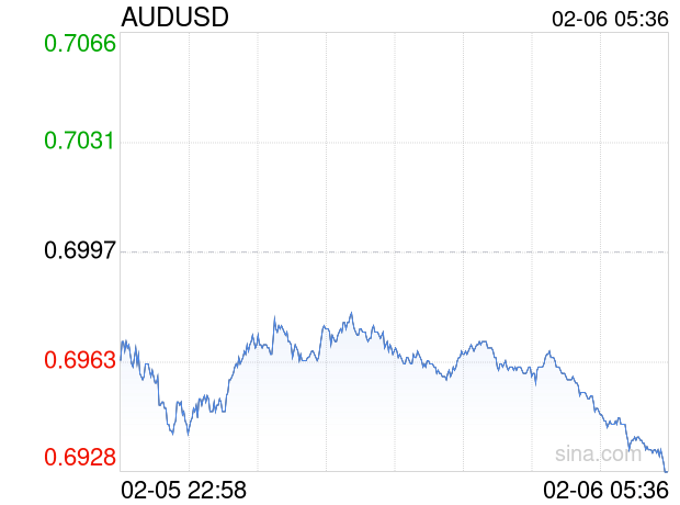 新浪外汇消息2026年02月06日,截至05时36分,外汇市场上澳元兑美元汇率跌破1澳元兑换0.6927美元。跌幅为-1.0004%