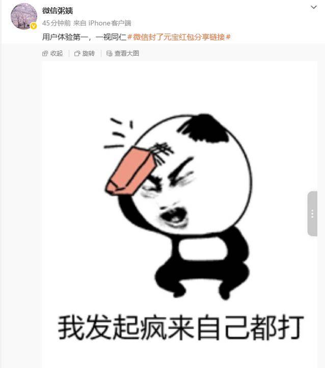 凤凰网科技讯 2月4日,微信公关总监“微信粥姨”发文回应“微信封了元宝红包分享链接”:称用户体验第一,一视同仁。还附上了一张“我发起疯来自己都打”的表情图。