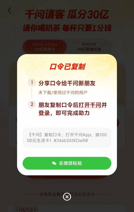 同时,还有部分用户在千问App点击分享活动至微信好友时,已自动改为复制口令形式。