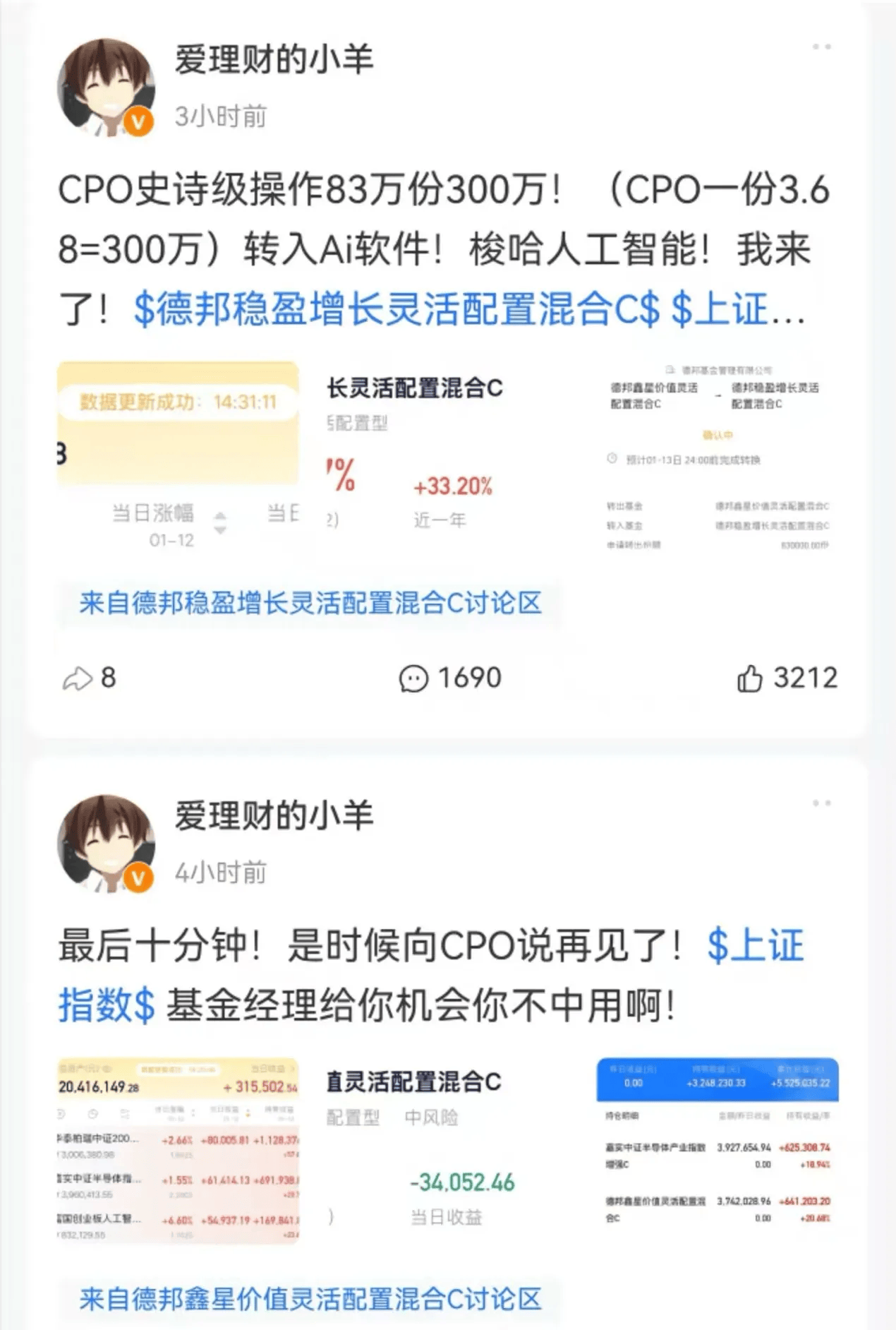 据了解,被“爱理财的小羊”带货的基金是德邦稳盈增长灵活配置基金。1月中旬,他曾在蚂蚁财富号上发布动态,称将卖出CPO转投AI,梭哈人工智能,并晒出了自己的购买金额,通过转换买入303.7万元,并通过现金的方式买入5万元。