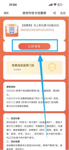 1.进入郑州市民卡app后,点击主页活动界面图进入,进入后点击中间【立即领取】进入领券界面。