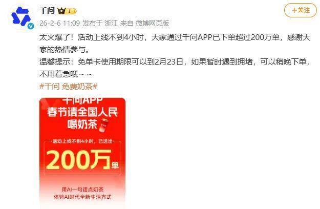 6日11时许,千问回应称太火爆了!活动上线不到4小时,大家通过千问App已下单超过200万单,感谢大家的热情参与。