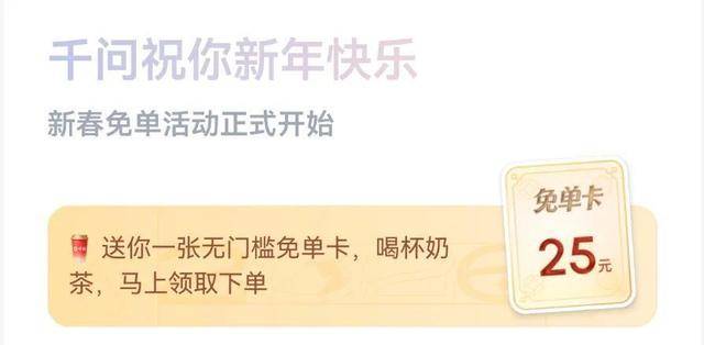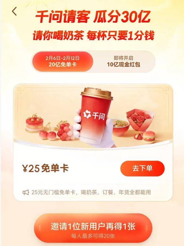 千问App活动页面显示,第一波免单活动时间为2月6日—2月12日。所有用户更新千问App后,都能白拿一张25元无门槛免单卡,不仅能免单喝奶茶,也能通过淘宝闪购买年货、点外卖。