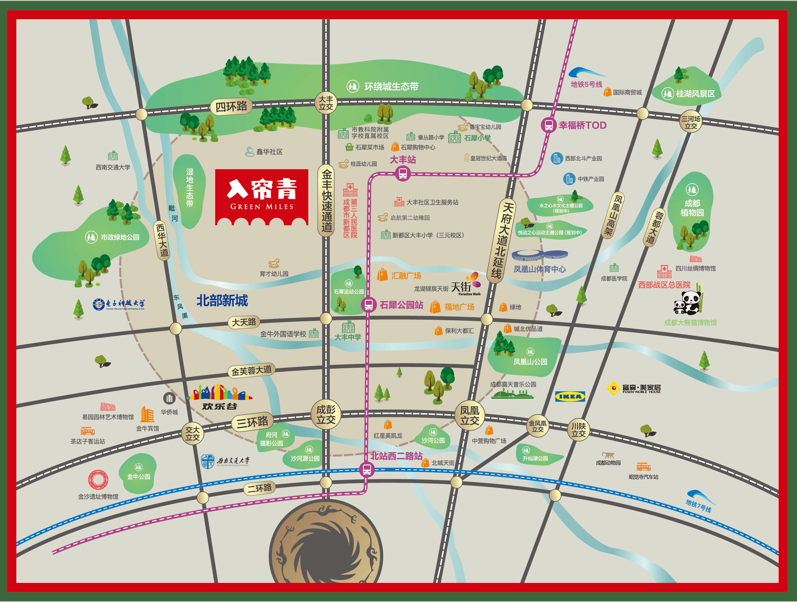 交通:四横四纵立体路网,地铁5号线贯穿南北。四横:三环路、金芙蓉大道、大天路、绕城高速;四纵:西华大道、金丰快速通道、天府大道北延线、蓉都大道。