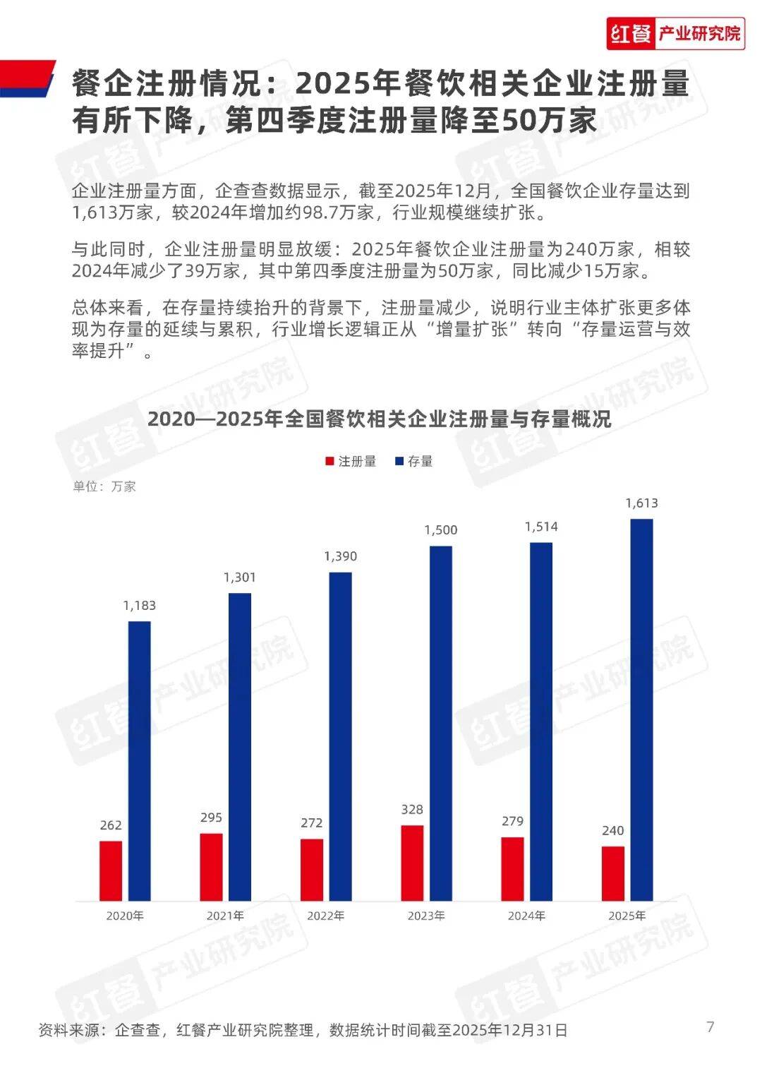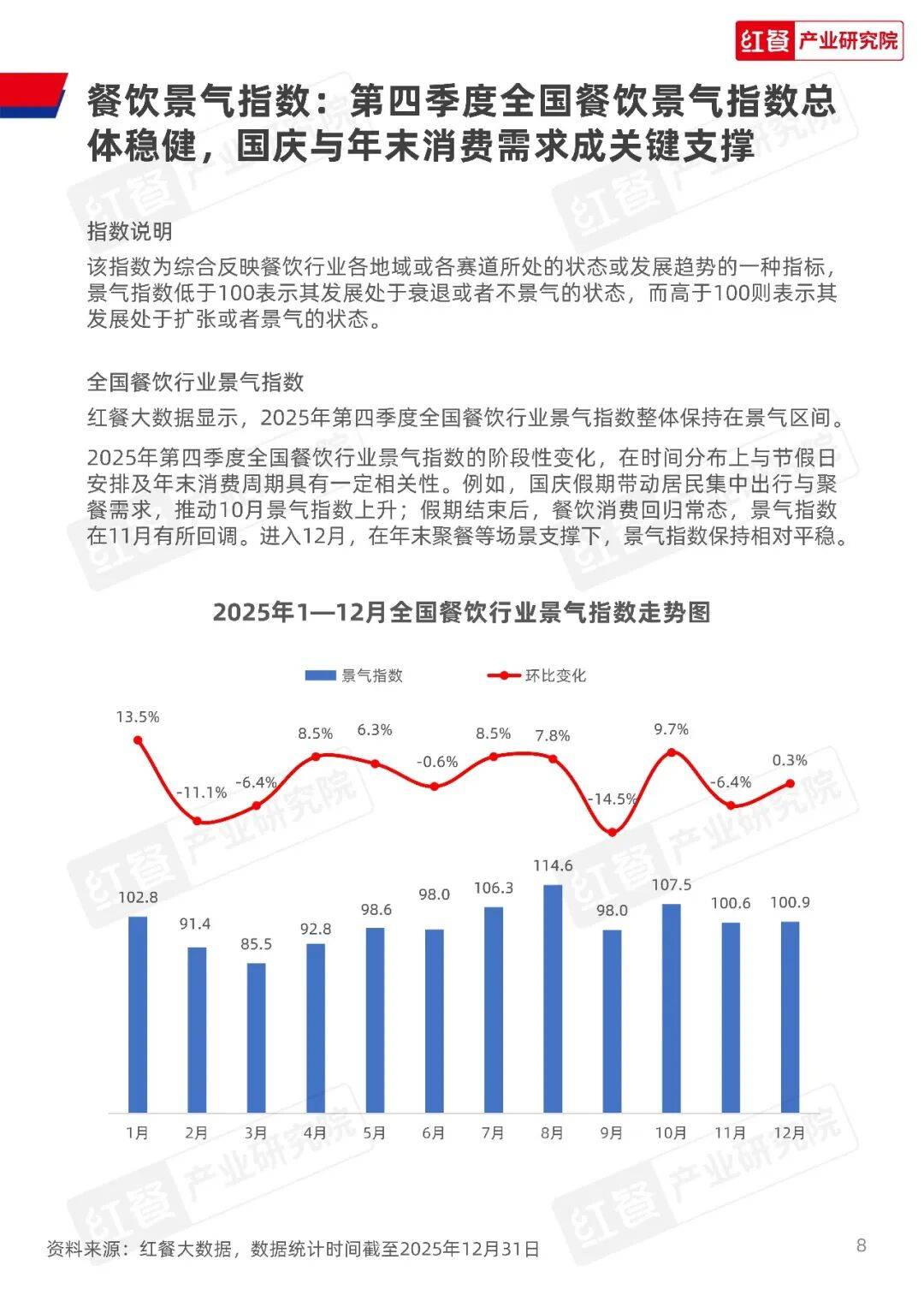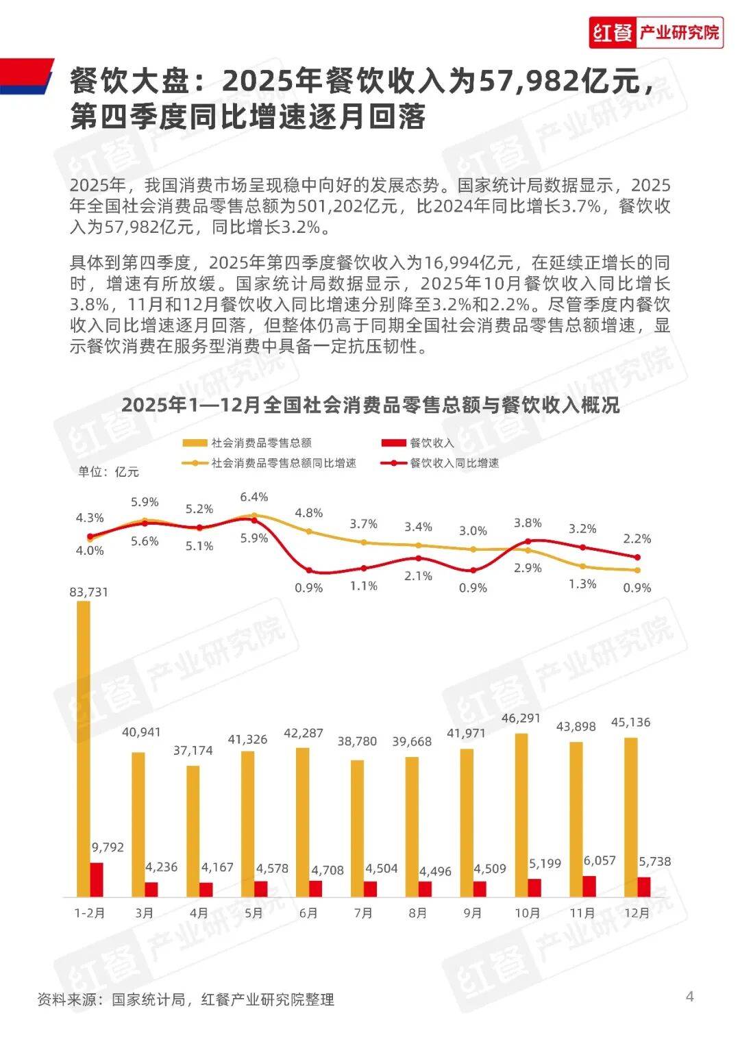 2025年餐饮收入57982亿元,Q4收入16994亿元,增速逐月回落但高于社零,行业景气指数总体稳健,国庆、年末需求支撑明显。食材价格上行,蔬果涨幅大,肉禽水产稳。餐饮企业注册量下降,存量扩张,增长转向存量运营。重点赛道中火锅景气,烧烤波动,现制饮品、火锅门店增长。