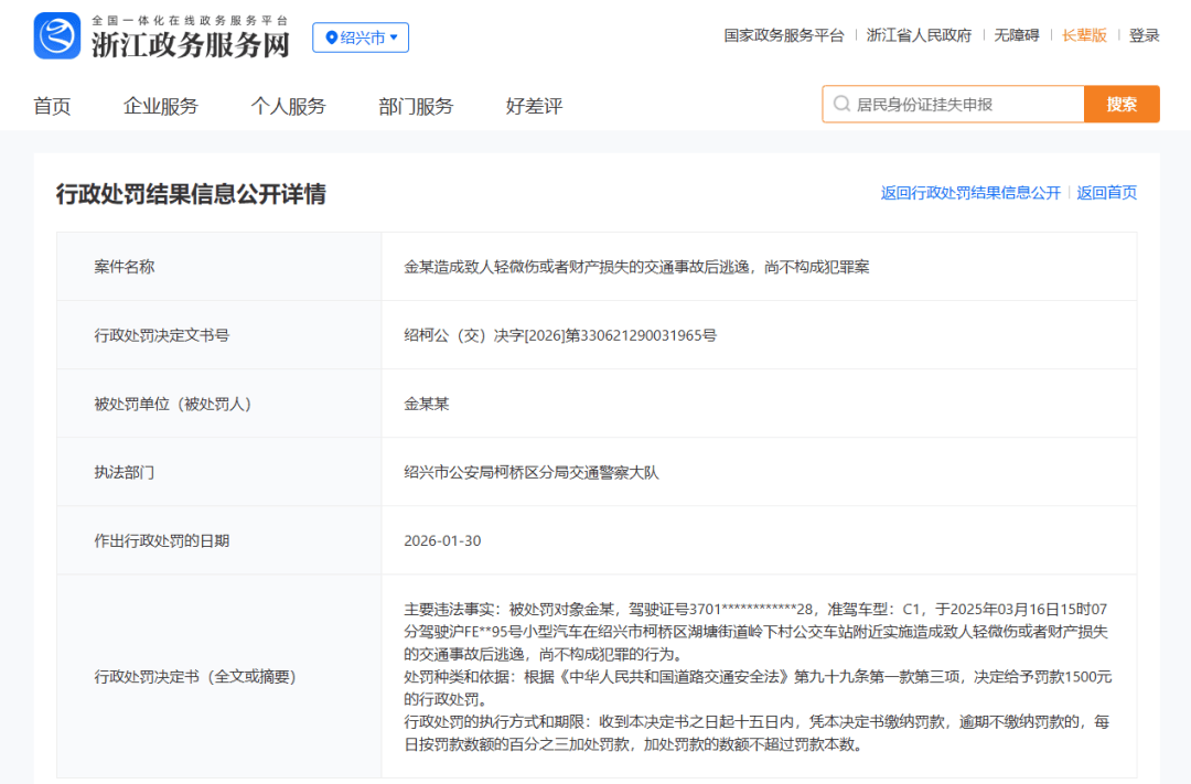 据浙江政务服务网,1月30日,柯桥区公安分局交警大队做出行政处罚,决定给予金某罚款1500元的行政处罚。