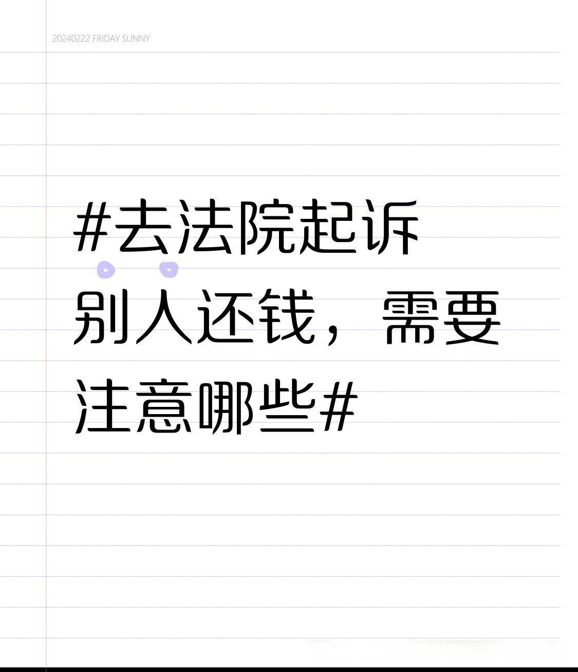 去法院起诉别人还钱,需要注意哪些 去法院起诉别人还钱,有不少要注意的地方。首先得有充分的证据,像借条、转账记录、聊天记录等。之前我一朋友起诉,就因为转账记录没备注用途,对方耍赖说是赠予,差点败诉。