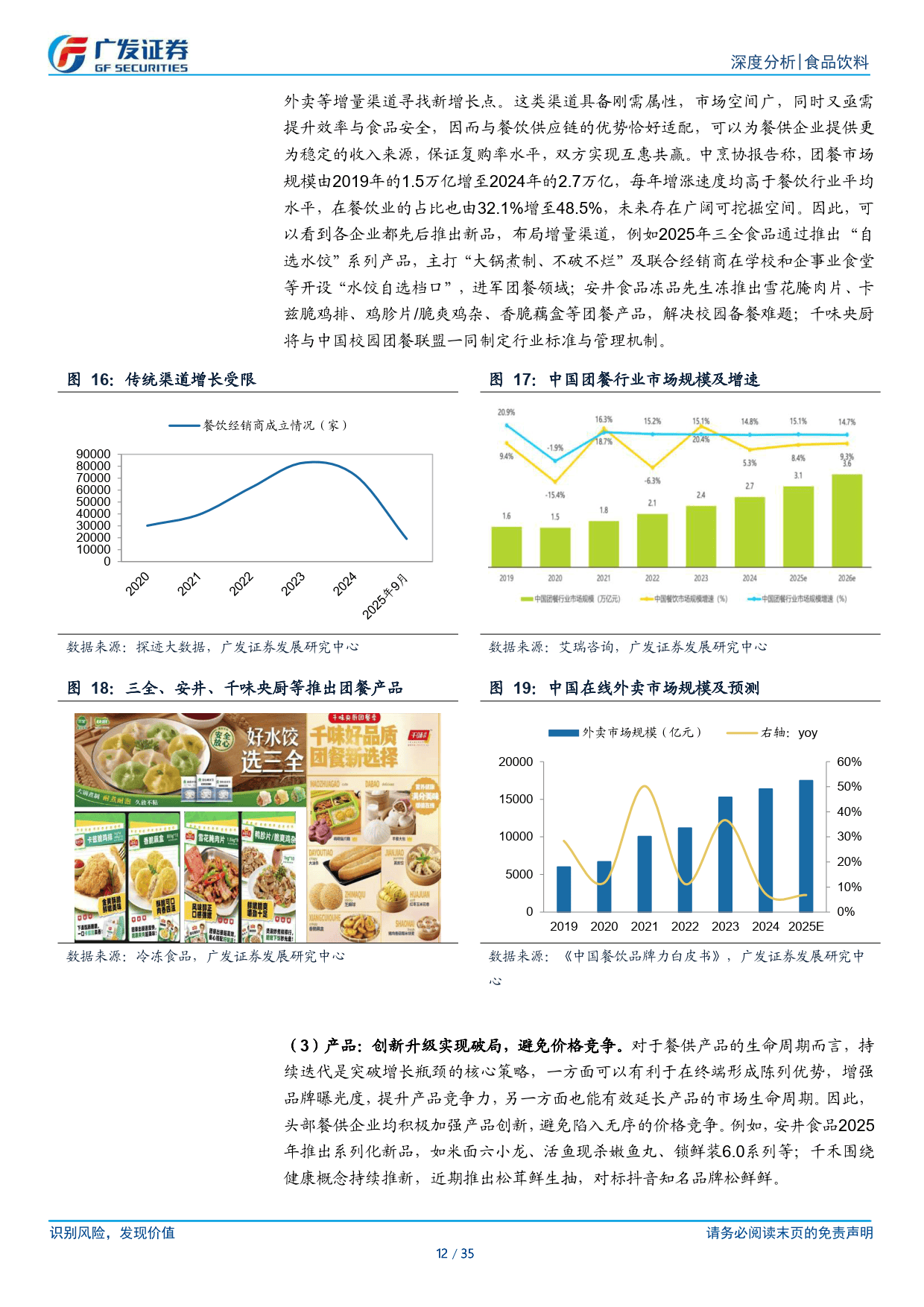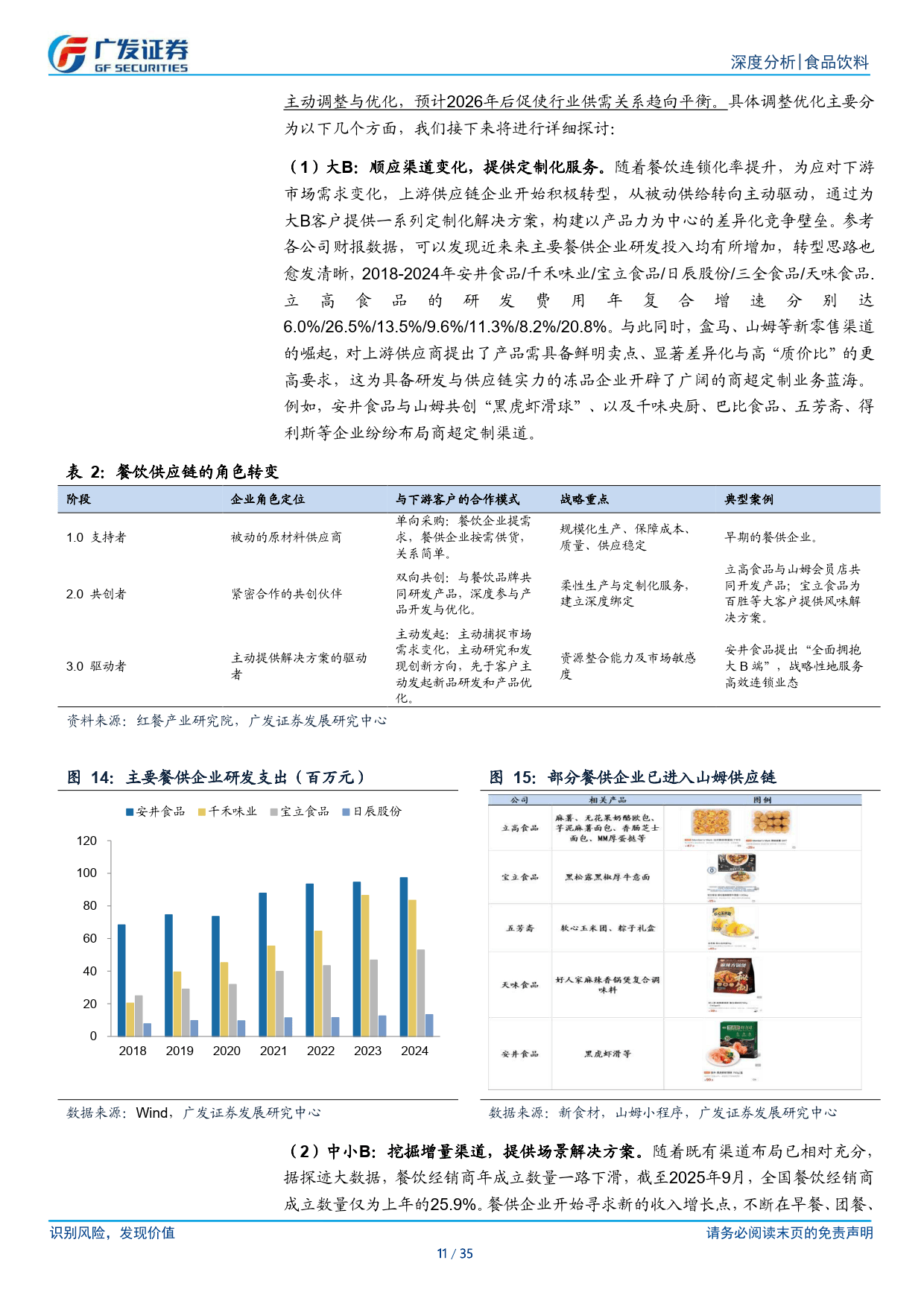 企业从 “被动支持者” 向 “主动驱动者” 转型,龙头企业摒弃粗放扩张,聚焦高效服务大 B 客户、精细化运营中小 B 客户。研发投入持续增加,2018-2024 年重点企业研发费用 CAGR 均保持增长,通过产品创新与定制化构筑壁垒。渠道方面,会员制商超、团餐、外卖等增量渠道快速拓展,团餐市场 2024 年规模达 2.7 万亿元,占餐饮业比重升至 48.5%。收并购成为行业趋势,企业通过渠道绑定、能力补强、上下游延伸等方式扩充边界。