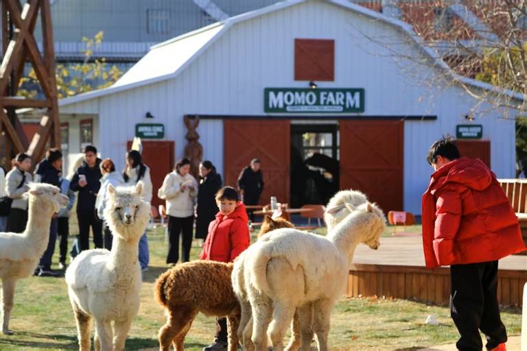 作为打造文旅融合、培育消费新场景的项目,中大门MOMO PARK没有生硬的围栏阻隔,萌宠与绿意共生,游客可近距离投喂羊驼、逗趣小浣熊、亲近奶牛。