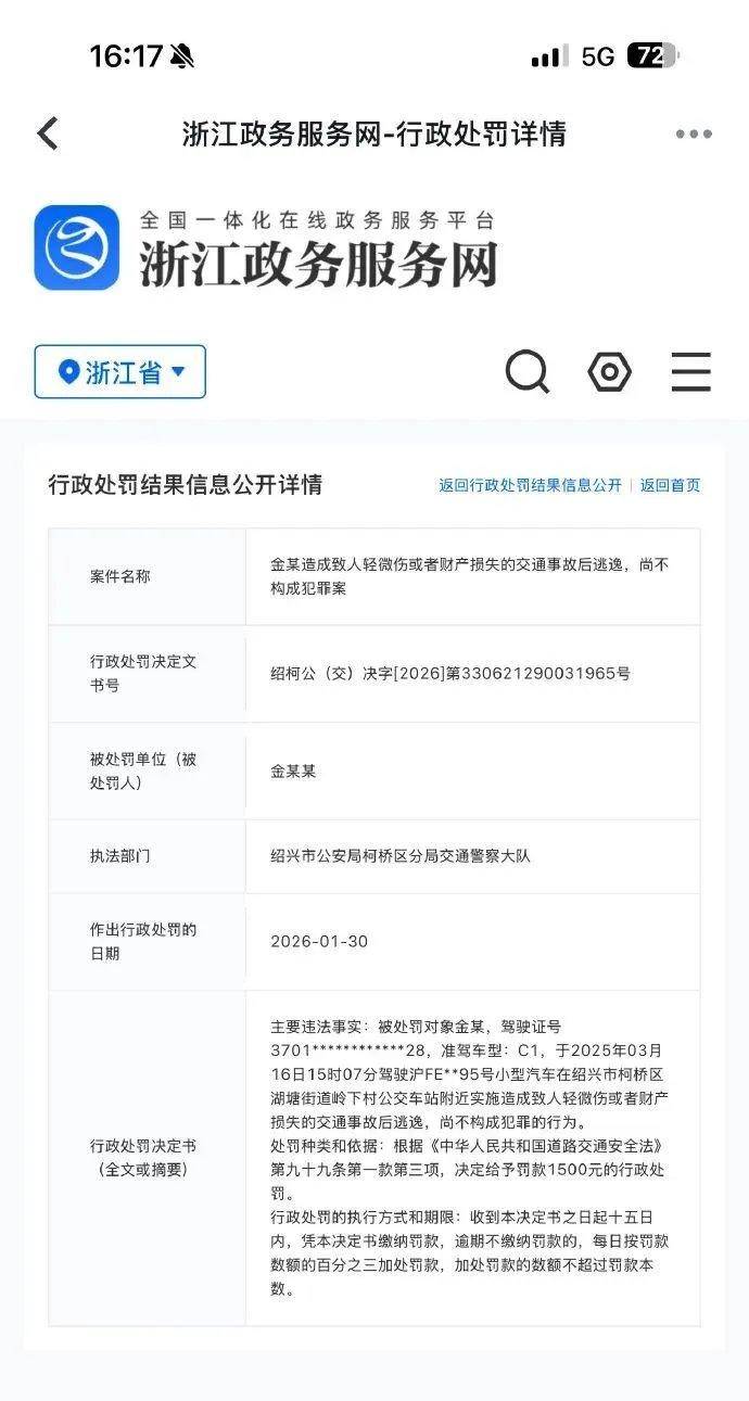 2月7日,浙江政务服务网显示,演员金某因交通肇事逃逸被罚款1500元。