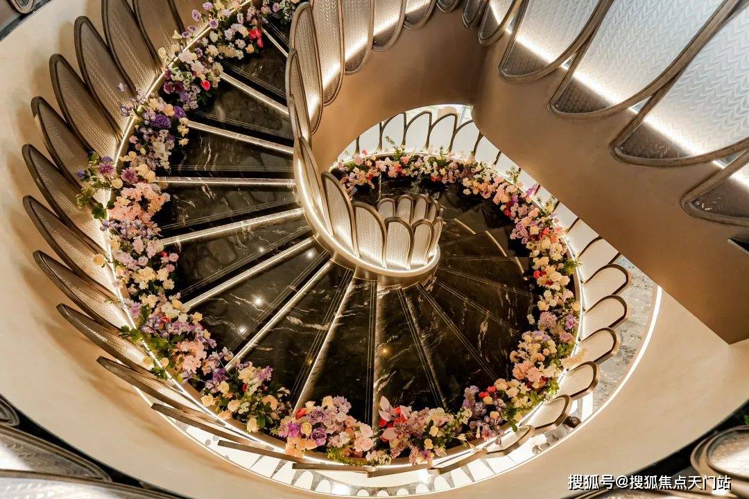 摩登旋转楼梯。楼梯已经贴上了定制的叶片状玻璃栏杆,朦朦胧胧的透光感,将会所旋梯的审美力,又拉上一个全新的高度。