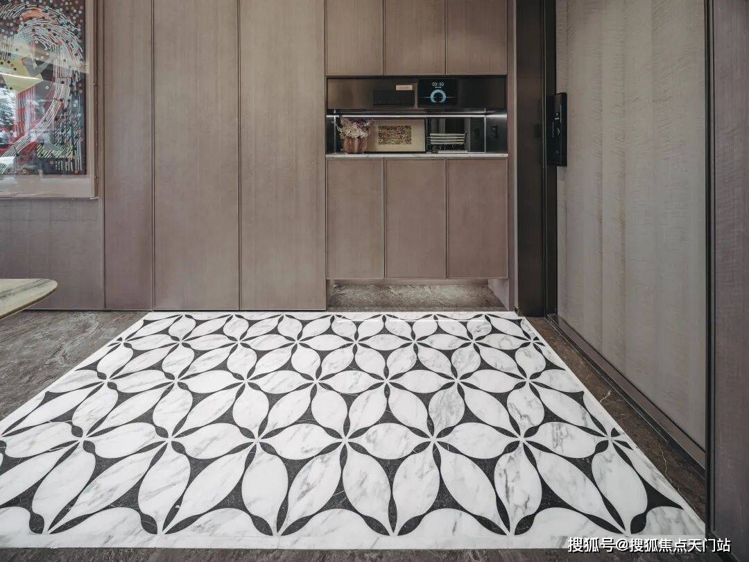 进门玄关柜采用双面科技木皮包裹,玄关地面的海派拼花。
