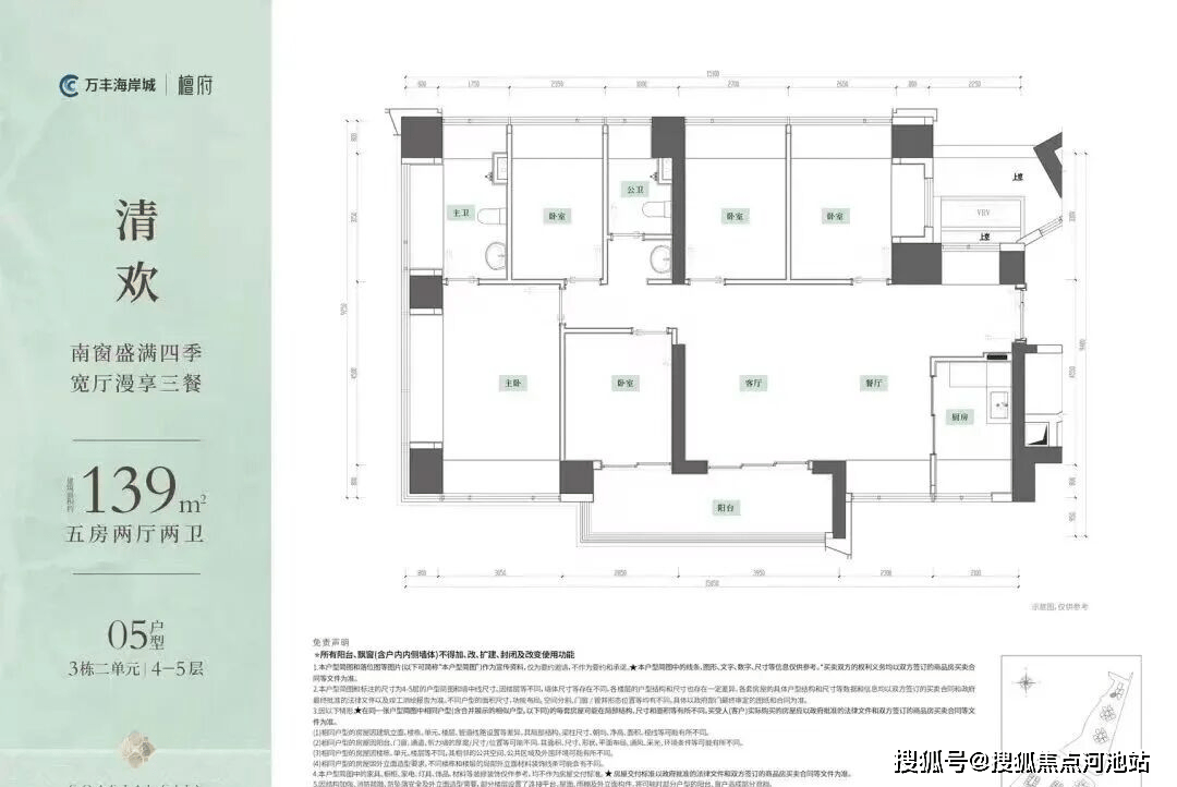 139㎡的5房2厅2卫,设计的是横厅南北通透格局,客餐厅6.25米开间,LDKB一体化,全屋12面飘窗,U型厨房,公卫三段式干湿分离,得房率约100%(包含赠送),客厅连接次卧出6.8米长的观景大阳台约11.9m²东南朝向。赠送面积约29.47m²。