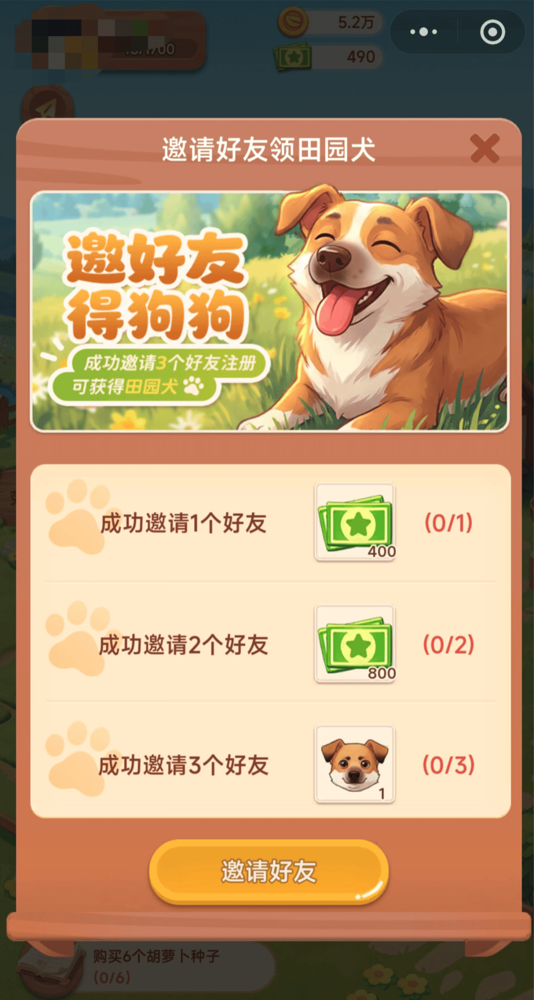 非得成功邀请到 3 个好友才能成功为自己的 “ 农场 ” 领到一只狗狗?
