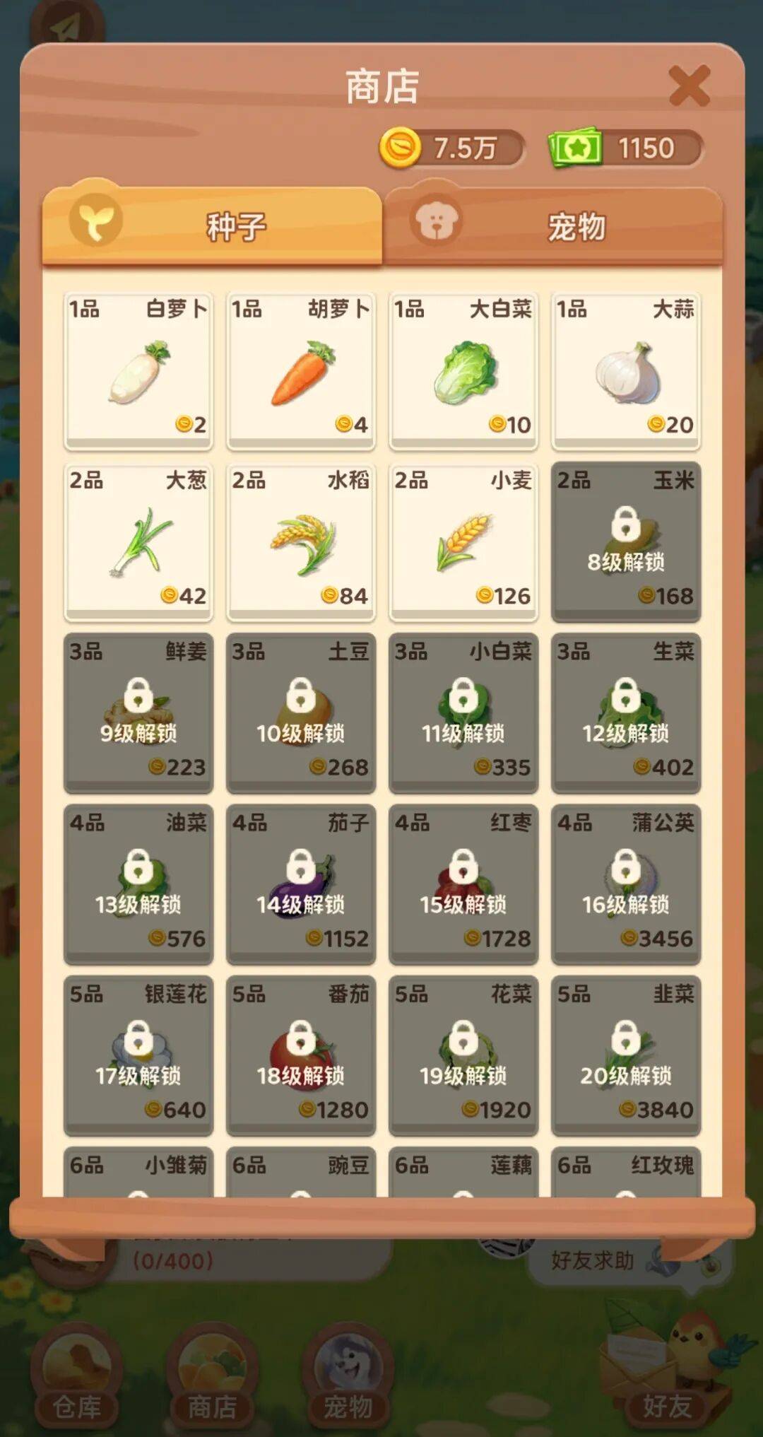 在游戏商店里买种子,现有 100 款不一样的水果、蔬菜、植物类种子,解锁的等级越高,能购买的选择种类就越多;