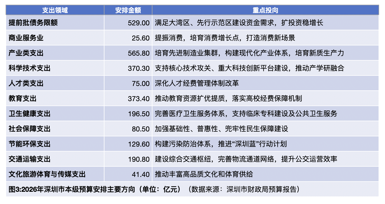 在新的一年市本级预算安排中,深圳财政支持全方位扩大内需,畅通国内国际双循环,大力提振消费、全力支持重大项目建设、用足用好债券资金、加快推进统一大市场建设。深圳市本级预算安排中,拟安排商业服务业支出25.6亿元,扩大商品和服务消费;安排政府投资项目资金500亿元,优先保障“十五五”规划项目落地实施;积极争取提前批债务限额529亿元,满足建设资金需求;完善有利于市场统一的财税制度,破除市场分割,防止“内卷式”竞争。