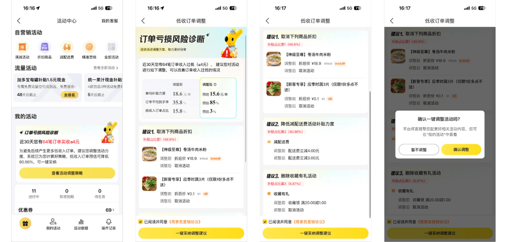 商家因设置活动不合理导致收入较低,平台预警后提供一键减负建议