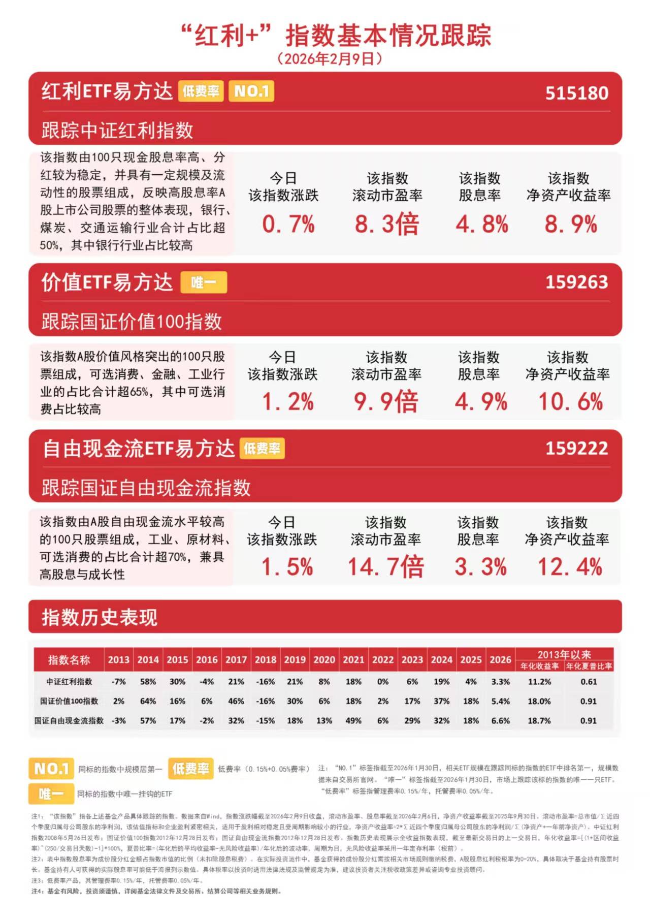 截至收盘,国证自由现金流指数上涨1.5%,国证价值100指数上涨1.2%,中证红利指数上涨0.7%。相关ETF受资金关注,红利ETF易方达(515180)、价值ETF易方达(159263)和自由现金流ETF易方达(159222)上周均连续五个交易日获资金布局,合计分别达5.6亿元、1.2亿元和1.6亿元。