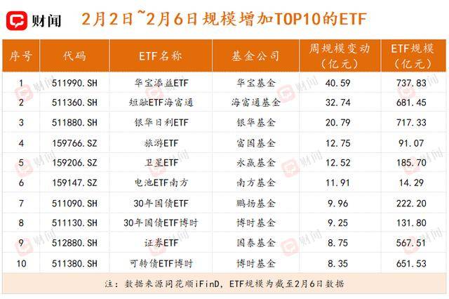 在2月市场波动加剧的背景下,资金行为呈现出明显的防御性特征。上周,资金在积极布局恒生科技板块的同时,也显著加码货币型ETF,华宝添益ETF(511990.SH)和银华日利ETF(511880.SH)单周规模分别增长40.59亿元和20.79亿元,分别达到737.83亿元和717.33亿元,一定程度上反映出资金“持币过节”的意愿。
