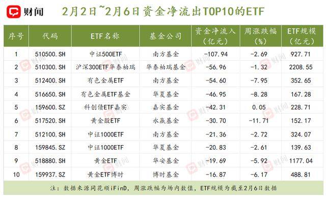 相较科技类资产的逆势吸金,此前表现强势的有色金属类及黄金相关ETF则成为资金净流出的主要领域。在净流出前10的ETF中,有色金属ETF(512400.SH)和有色金属ETF基金(516650.SH)分别净流出54.60亿元和46.95亿元;与此同时,黄金类ETF亦面临抛压黄金股ETF(517520.SH)、黄金ETF(518880.SH)以及黄金ETF博时(159937.SZ)分别净流出30.70亿元、19.69亿元和16.87亿元。