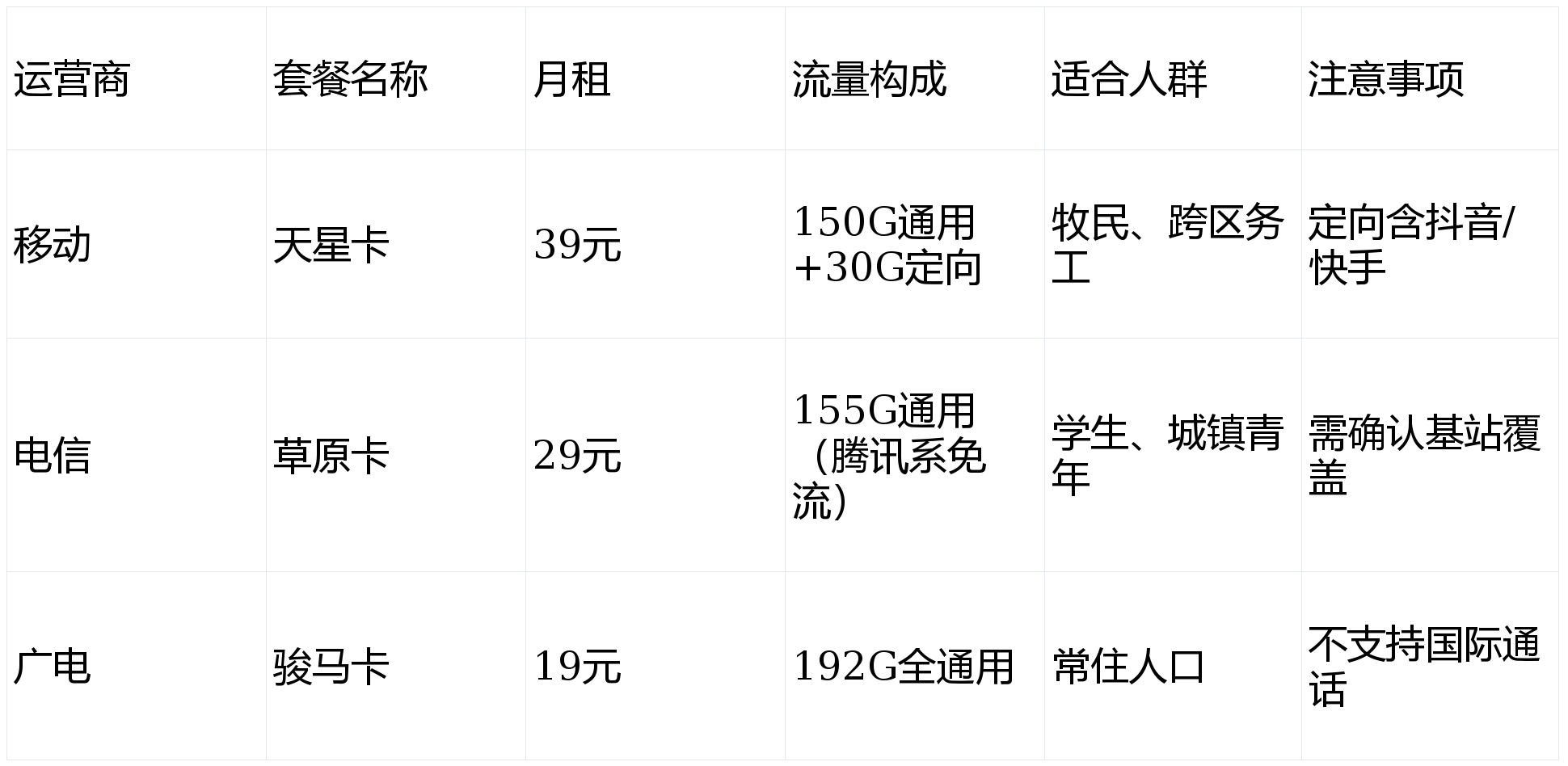 - 优势:全旗98%的行政村有基站,霍林河矿区地下200米都能通话。套餐如29元100G通用+30G定向,适合长期在外的牧民。