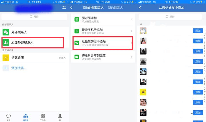 首先,企业微信是没有一键同步微信好友的功能的,这样就不能添加我们的个人微信好友了吗?并不是,我们可以在企业微信绑定了我们的个人微信后,在通讯录页面点击「添加外部联系人」-「从微信好友中添加」,此时可以看到好友旁边都有一个「添加」按钮,这样就可以快速选择我们想要添加的个人微信好友了。