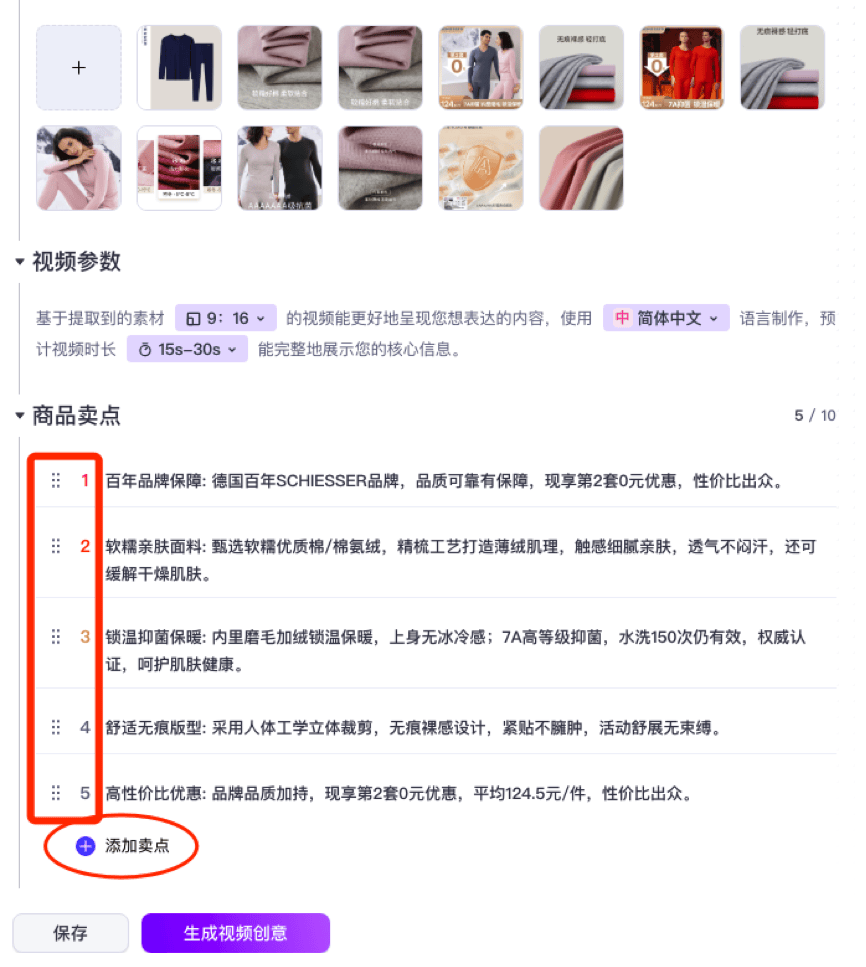 比如我在保暖内衣套装商品的视频生成中,创作Agent就根据抖店链接自动提炼了多个卖点,我还可以自己添加卖点并调整卖点次序: