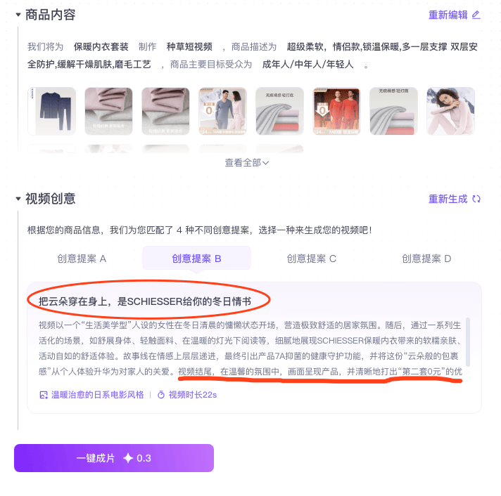 系统会根据卖点次序生产多个创意文案供商家选择。而且,每一个创意选项,都能根据经营逻辑,自主规划视频的故事结构,前几秒如何抓眼球,中间应该如何铺陈产品卖点,最后如何引导用户下单行动。这种自主讲述营销故事的AI,还是头一次见。