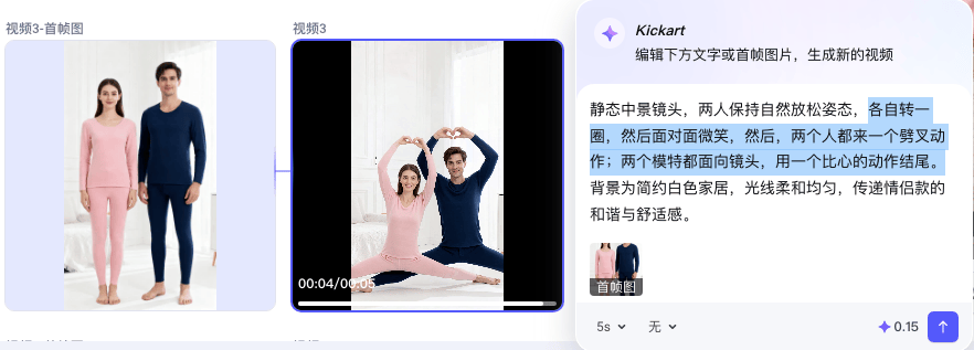 没想到,等了几分钟后,当两个平面模特转了一圈又劈叉又比爱心的时候,我被惊到了,原来,AI不只是可以让平面模特简单动一下,竟然还能让他们做出更多搞笑造型,让严肃的电商主图变得调皮起来。