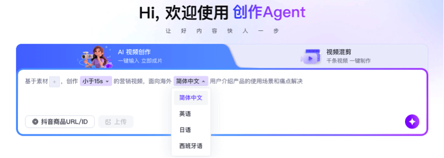 哪怕是商家做海外营销视频,创作Agent也能提供,目前支持英语、日语、西班牙语。