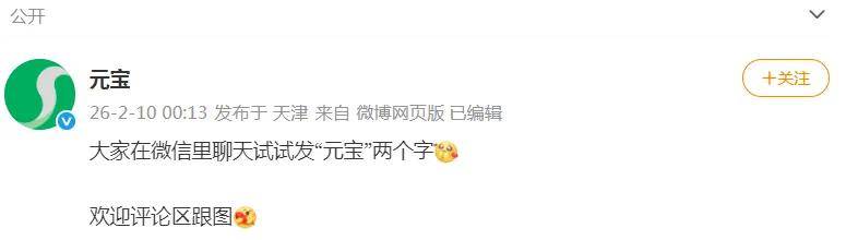 2月10日凌晨,@元宝 发文表示:大家在微信里聊天试试发“元宝”两个字。
