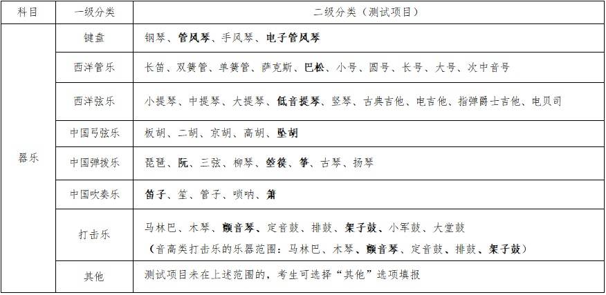 2.器乐:乐器种类按以下分类及项目执行(标黑为调整内容):