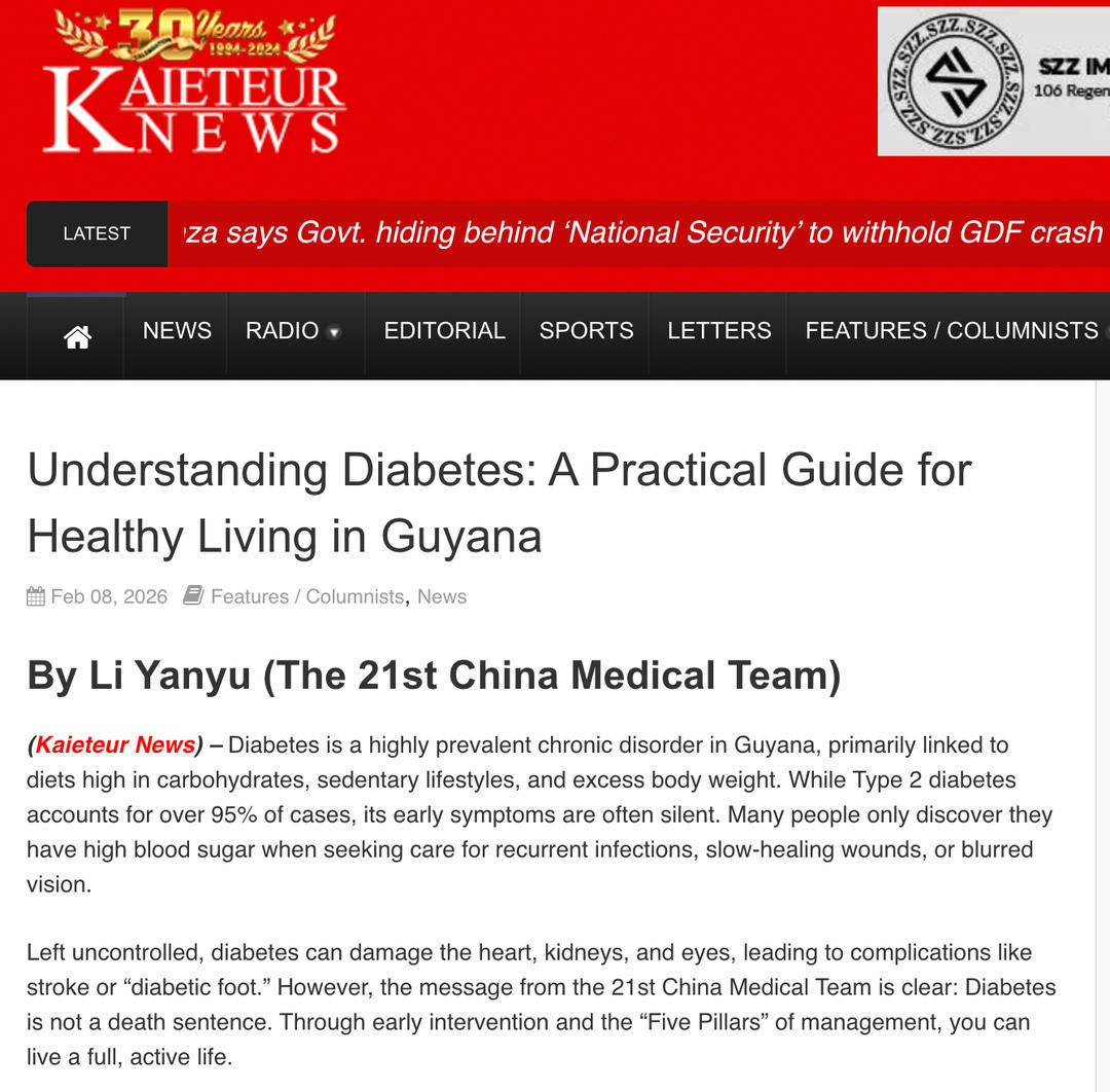 “早期干预对控制糖尿病至关重要,中国医生的专业分享让我们收获很大。”2月8日,一篇由第21批援圭亚那中国医疗队宣传委员李妍雨撰写的糖尿病防治科普文章,在圭亚那发行量最大的《凯丘新闻报》刊出并引发关注。这篇文章的发表,意味着援圭医疗队在当地主流媒体开设的首个健康科普专栏正式启动,也是医疗队以实际行动响应二十届四中全会“强化健康科普传播,提升全民健康素养”要求的生动体现。