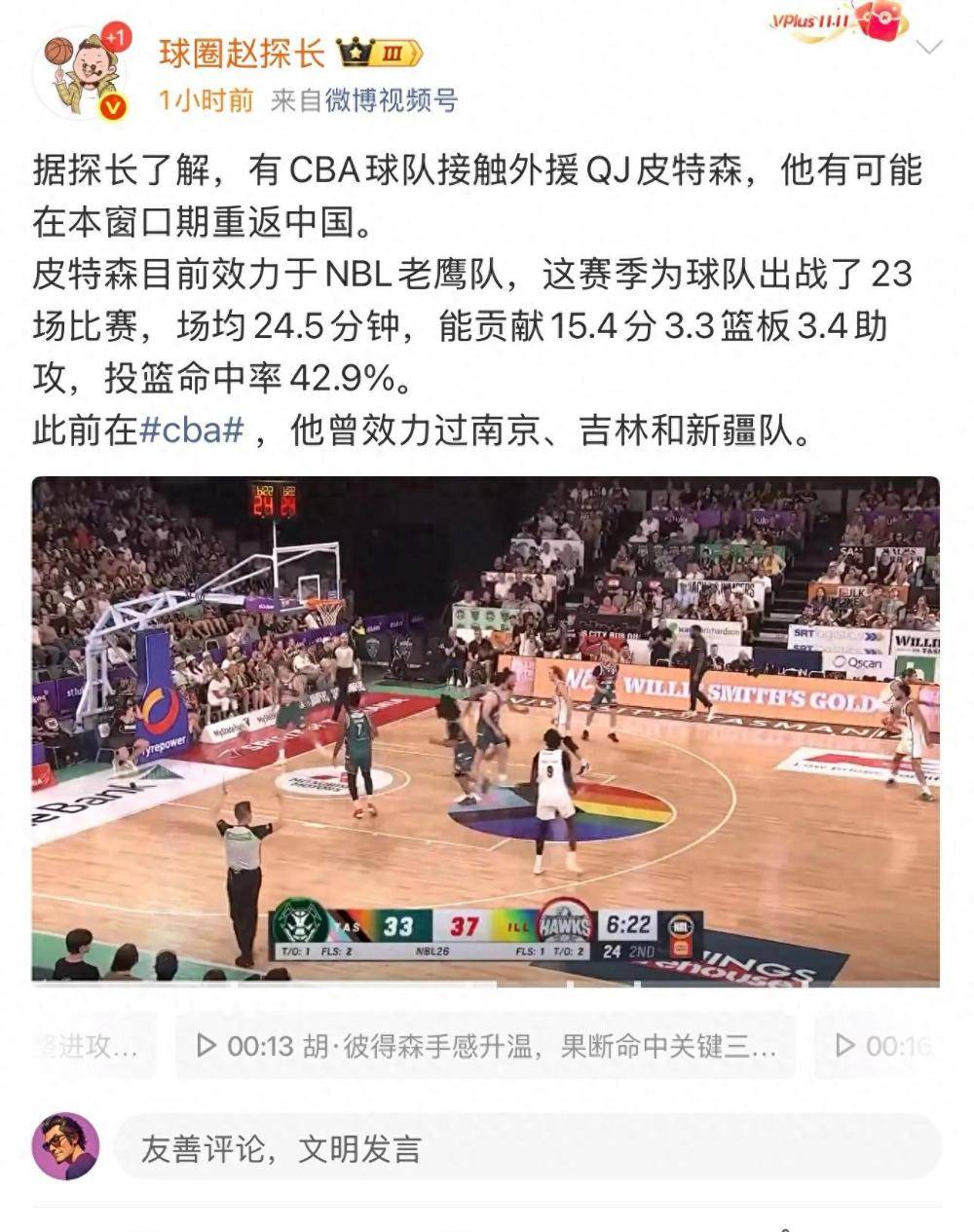 NBL赛季刚结束,CBA的引援战场已经硝烟弥漫。 澳大利亚NBL常规赛收官当天,多家CBA俱乐部迅速将目光投向老鹰队外援皮特森。这位在CBA征战过三个赛季的“老熟人”,目前手握多份报价,而北控男篮成为最积极的竞争者。