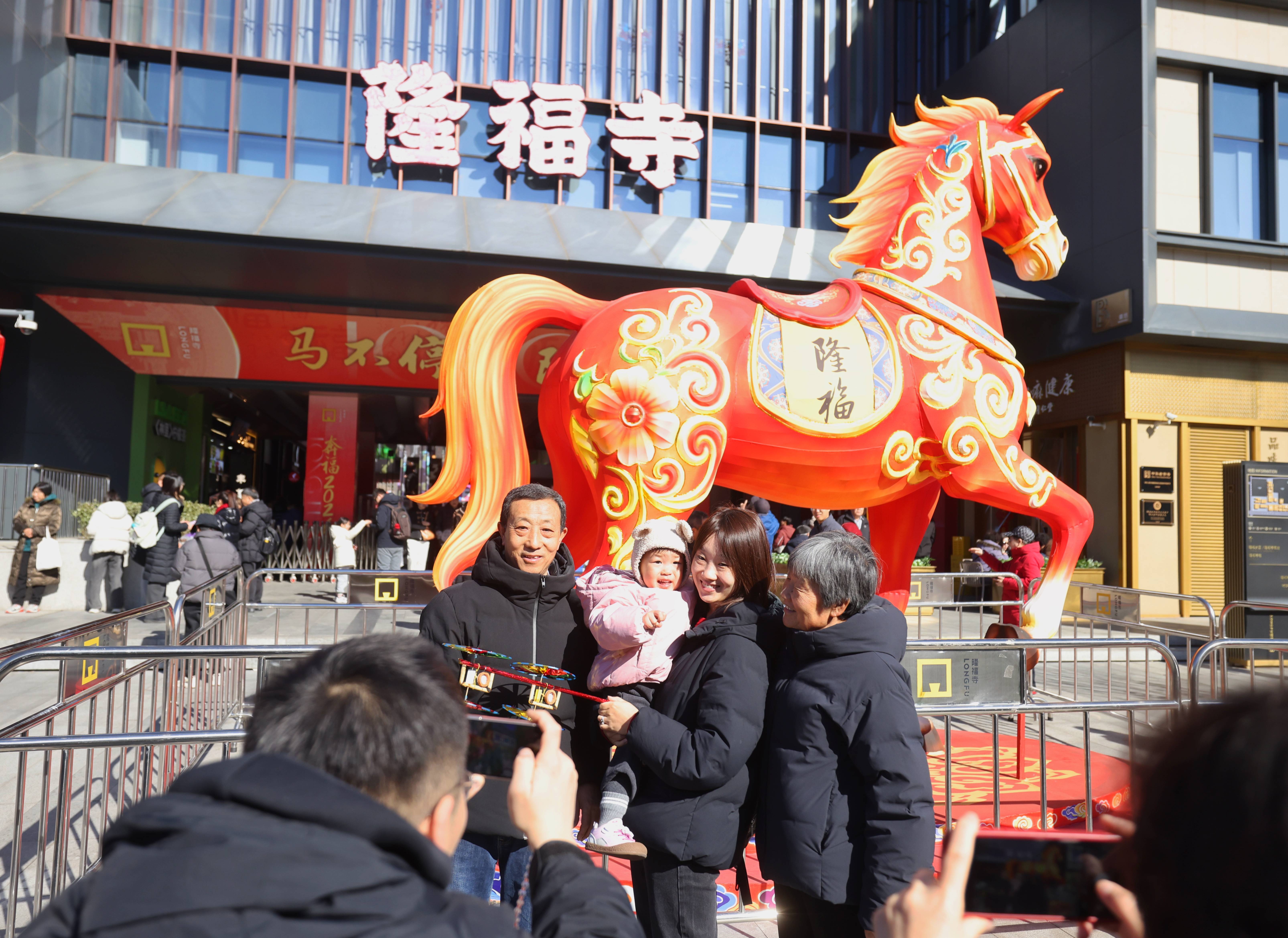 2月18日,隆福寺新春市集火出圈,市民与“隆福马”雕塑合影留念。新京报记者 王贵彬 摄
