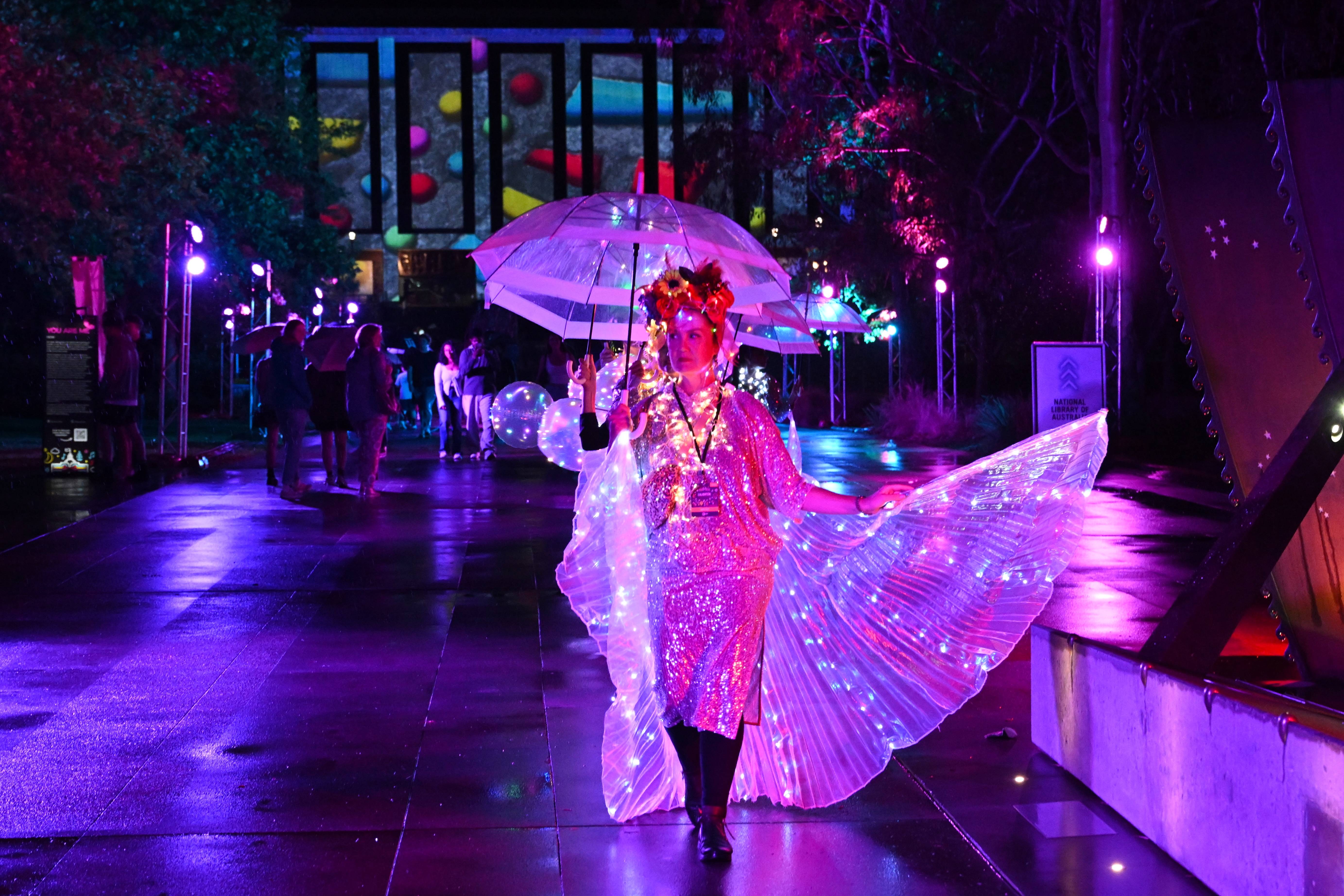 3月1日,在澳大利亚堪培拉“点亮堪培拉”灯光秀上,演员身着LED服饰表演。 新华社/欧新