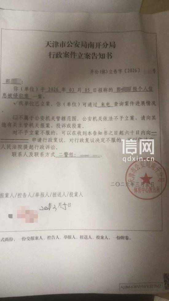 发稿前,郭先生向信号新闻表示,他已就此事向属地公安机关报案。3月5日,天津市公安局南开分局体育中心派出所给郭先生出具了行政案件立案告知书。(耿润 徐基峰)