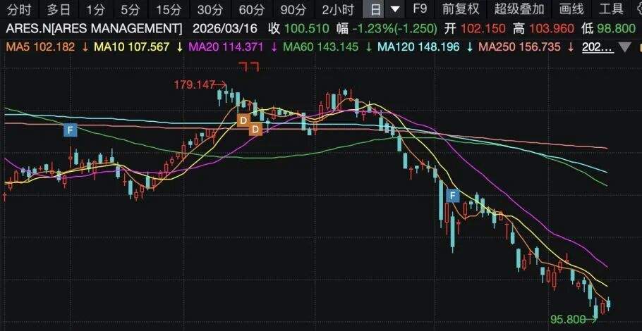 赎回压力传导至资本市场,直接引发了相关标的股价集体下挫。3月以来(截至3月16日),蓝鸮资本(Blue Owl Capital)股价累计下跌16.97%、年内跌幅更是超过40%,Ares Management今年3月也下跌超过10%。仅在3月6日当天,贝莱德股价就大跌7.17%,蓝鸮资本、KKR、Ares Management也分别下跌5.09%、4.46%和6.01%。