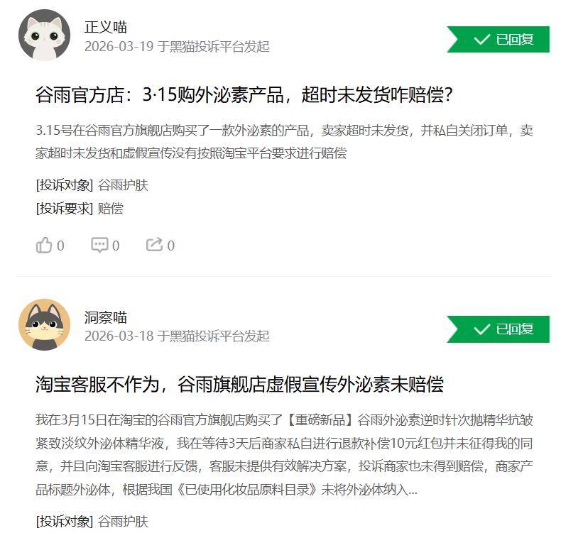 就拿谷雨在消费者中间的反馈来说,在第三方投诉平台“黑猫投诉”上,近期出现了多起关于“谷雨外泌素”产品的投诉,涉及“虚假宣传”、“超时未发货”等问题。