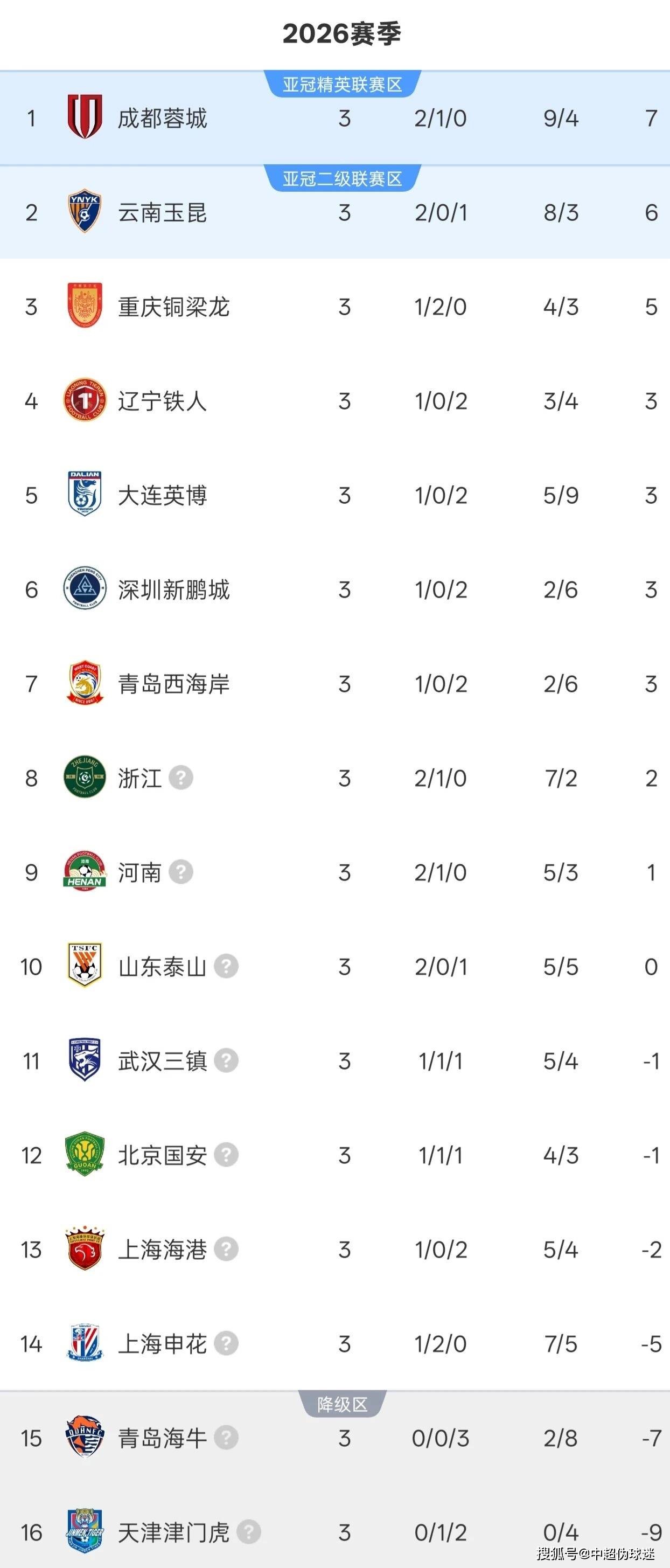 3轮过后,仍然有多达6支球队积分是负分。其中,三镇、国安积-1分,上港积-2分,这3支球队仅需一场比赛便能“转正”。