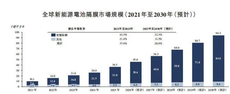 在储能电池市场规模大爆发的背景下,涂覆隔膜市场规模也在大幅上升。2025年,全球涂覆隔膜市场规模为310亿平方米,同比增长近28%。