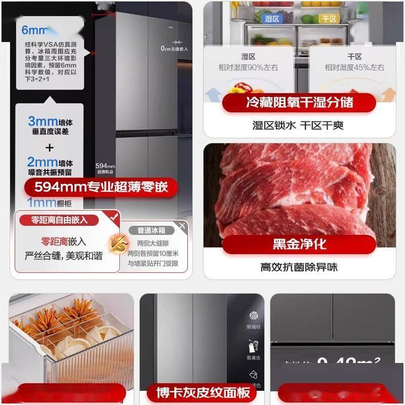 清晨的第一缕阳光透过纱帘洒进厨房,一台通体哑光黑、面板如钢琴漆般温润的冰箱静静矗立在角落。它没有传统冰箱的笨重感,594mm的超薄机身与定制橱柜完美齐平,仿佛本就是厨房设计的一部分。这就是海尔491升十字四开门冰箱——用「零距离嵌入」技术重新定义了高端厨电的形态美学。