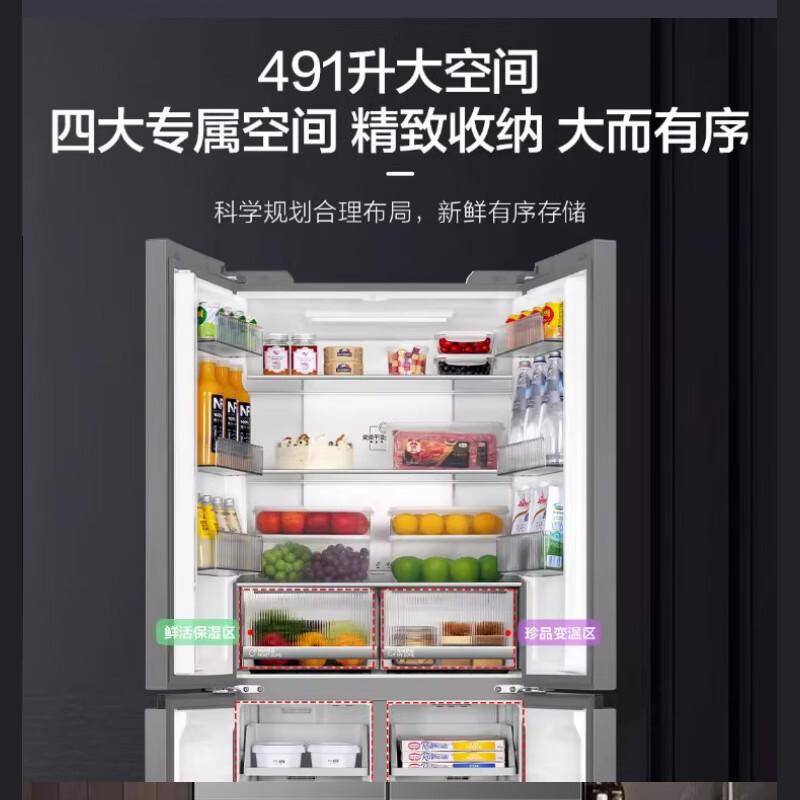 打开冰箱的瞬间,你会发现它的内部布局像瑞士军刀般精准高效。491升的容积被科学划分为16个精细分区:上层对开门是宽敞的冷藏区,下层十字四开门则藏着冷冻室的秘密。这种设计让取物效率提升40%——不需要像传统对开门冰箱那样整个人探进去找东西,只需轻轻拉开相应舱门。