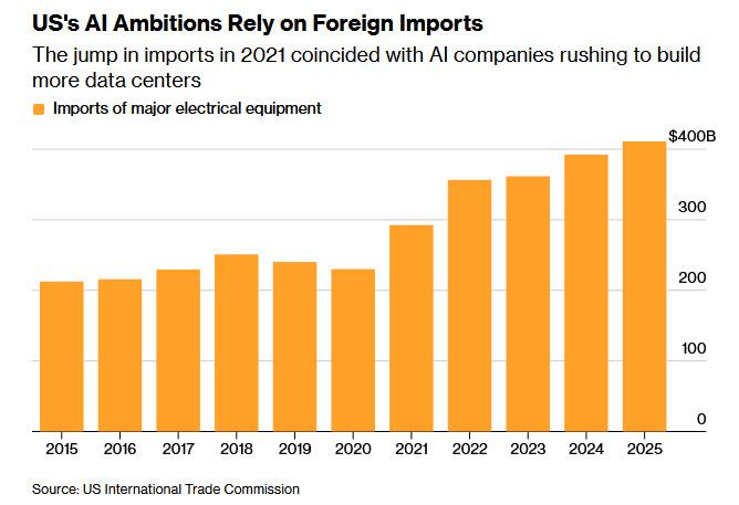 据彭博报道,美国国内制造产能无法跟上需求增速,建设方不得不大量依赖进口。GE Vernova电气化部门首席执行官Philippe Piron指出: