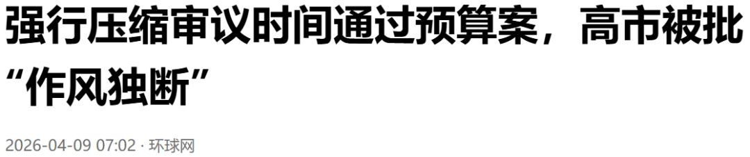 法案通关过程堪称丑陋的独裁表演。为赶进度,高市早苗动用了粗暴的行政手段。执政党凭议席优势剥夺在野党发言权,无视规则动用特权强行闯关。