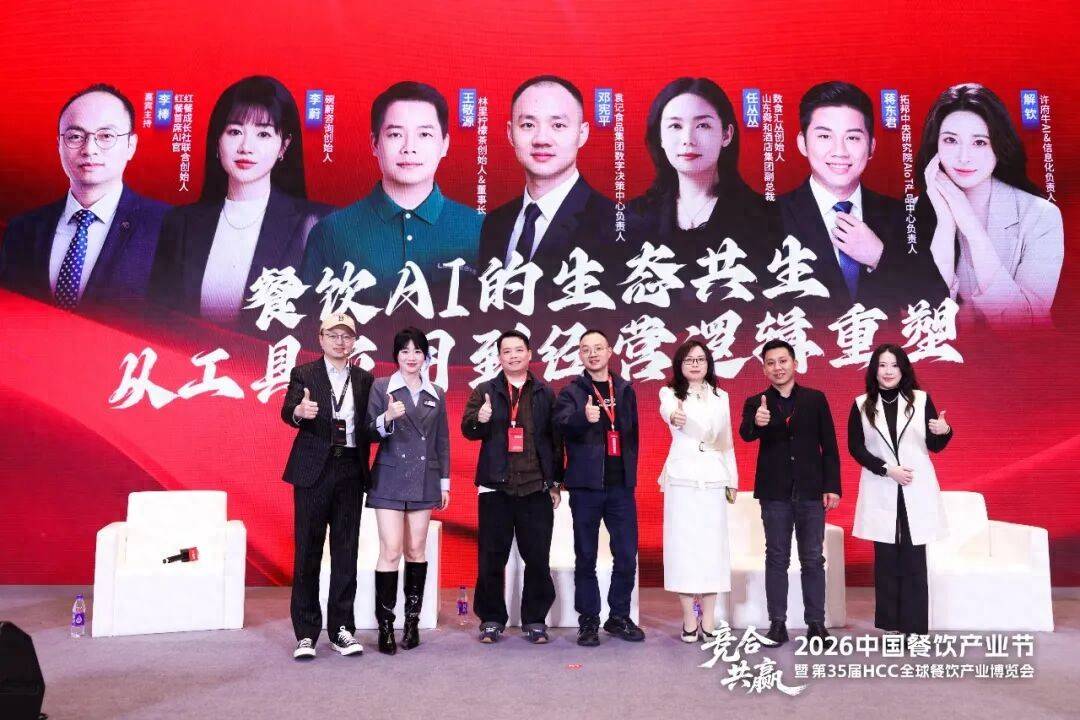 在“2026中国餐饮产业节暨第35届HCC全球餐饮产业博览会”上,红餐首席AI官、红餐成长社联合创始人李棒与碗蔚咨询创始人、羽化小红花AI联合创始人李蔚,林里柠檬茶创始人兼董事长王敬源,袁记食品集团数字决策中心负责人邓宪平,山东舜和酒店集团副总裁、数食汇丛创始人任丛丛,拓邦中央研究院AloT产品中心负责人蒋东君,许府牛AI&信息化负责人解钦,围绕“餐饮AI的生态共生,从工具应用到经营逻辑重塑”展开了一场深度对话。