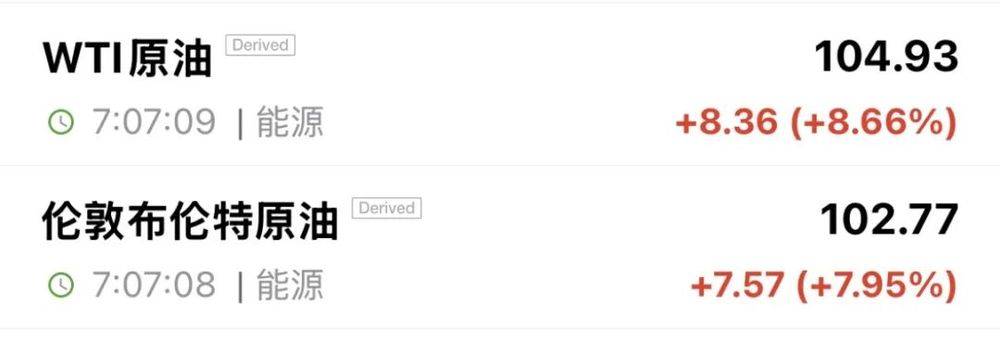 4月13日早盘,布油、WTI原油期货开盘跳涨,截至发稿,布伦特原油涨7.95%报102.77美元/桶,WTI原油涨8.66%报104.93美元/桶。