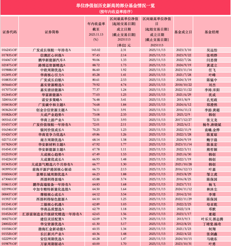 信澳匠心回报A、鹏华新能源汽车A的单位净值也同样在11月13日创下历史新高,年内收益率分别为97.43%、90.06%;路博迈资源精选A、中欧周期优选A、华商核心引力A、广发成长启航A的年内收益率也均超80%。