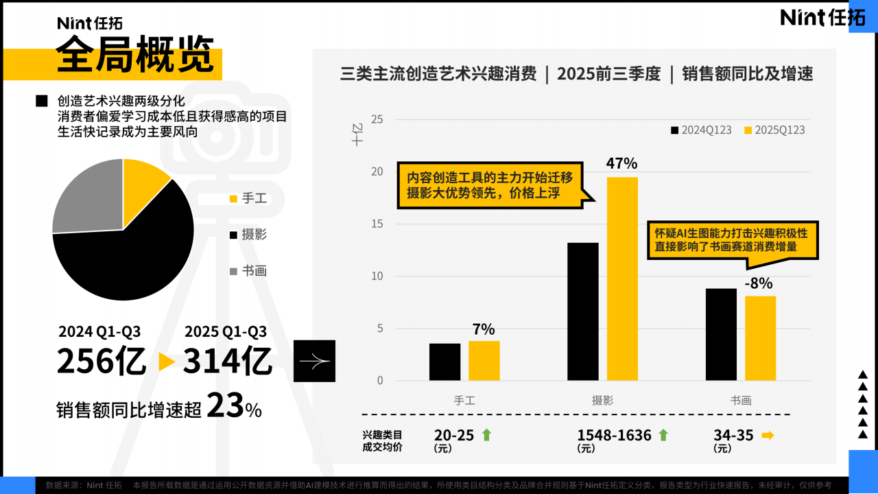 2025年Q1-Q3兴趣品类电商消费市场规模达3852亿元,同比增速超10%,主流消费群体消费信心回升,愿意为生活附加价值支出,且不仅享受兴趣本身,还热衷于将兴趣输出为个人内容。兴趣消费主要涵盖运动&健康、娱乐&收藏、创造&艺术、生活&美食四大领域,其中娱乐收藏占比25%、创造艺术23%、生活美食20%(含美食7%、生活相关13%)、运动健康12%(运动4%、健康8%)。运动健康领域整体小幅增长,户外人群部分转向室内,球类成为新风潮,羽毛球仍是第一球类但受台球威胁,壁球增长潜力可观;室内运动中瑜伽拉动增长,家庭健身设备趋向小型化,射箭逆势增长,户外领域露营再度升温,登山相关品类表现亮眼,单车市场遇冷。娱乐收藏领域高速增长,潮玩盲盒卡牌类引领增速,动漫周边、成年向潮玩等表现突出,三坑市场中洛丽塔价量双增,甜美系为主要风格,日常化趋势明显。创造艺术领域呈现两极分化,摄影类目凭借运动相机、口袋云台等实时记录型产品保持领先,手工类中拼图、拼豆等小众新潮项目增速迅猛,而书画赛道受AI生图影响消费增量受限。生活美食领域持续扩容,烹饪烘焙中果蔬消毒清洗机等厨房小电成为黑马,茶咖酒饮消费量稳定但子类洗牌,茶具趋向便捷化、咖啡器具强调仪式感;宠物园艺双赛道飙增,猫狗食品用品为核心驱动力,园艺领域异植和智能种菜机受青睐,生物陪伴成为重要情感寄托。